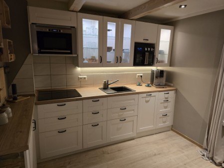 Wir bieten Ihnen eine Küchenzeile mit Induktion-Kochfeld, Mikrowelle, Mini Backoffen, Geschirrspüler und sämtlichem Geschirr und Kochutensilien. Kaffeevollautomat und Wasserkocher sind ebenfalls vorhanden.